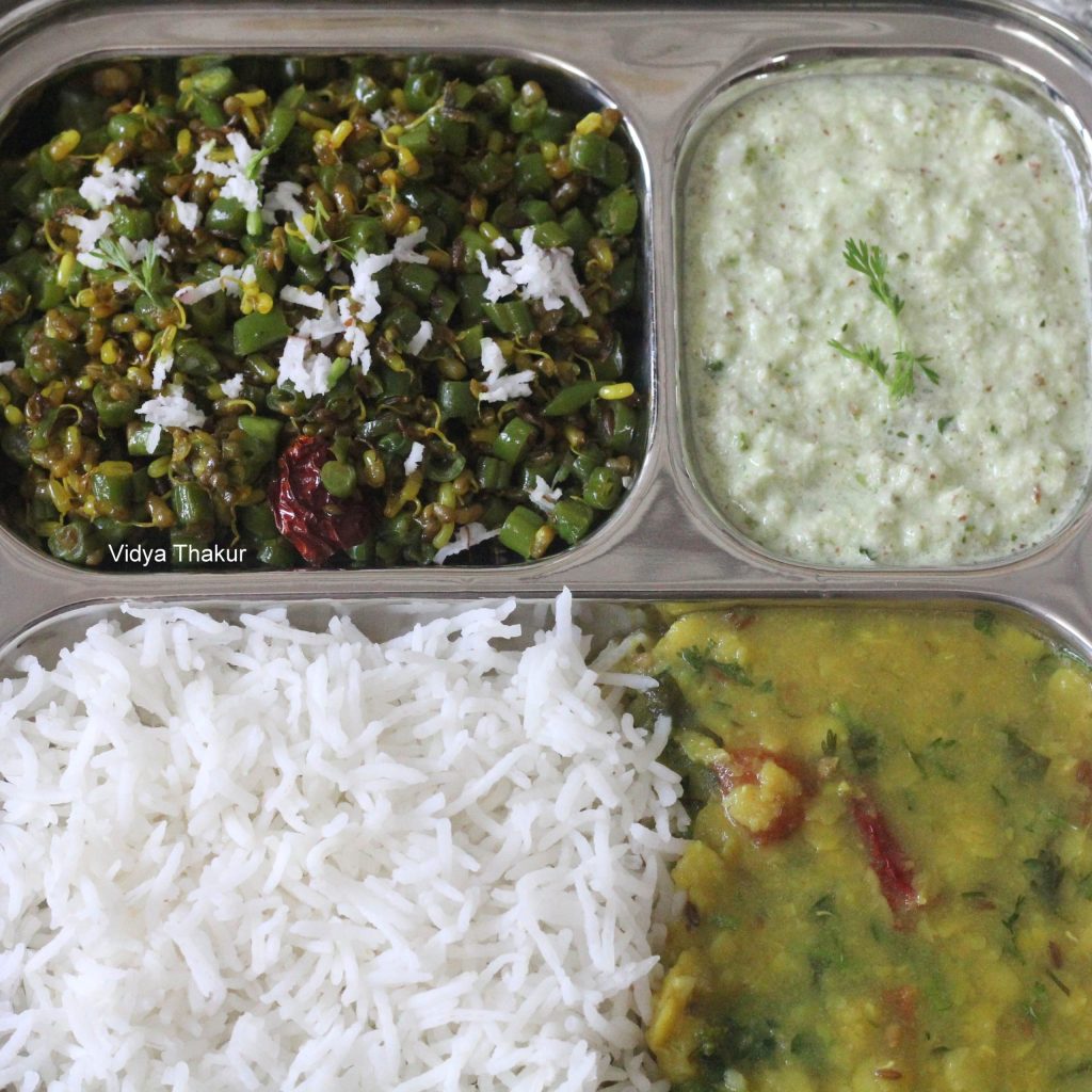 - Switch off the flame once done and garnish with a mix of freshly grated coconut and finely chopped coriander leaves. I served it with dal rice and raw mango chutney / Kairi chi Chutney.
