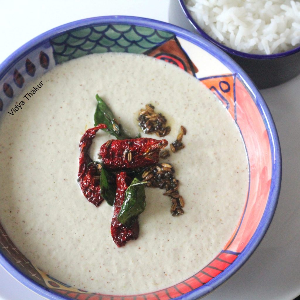 - Transfer the mix to a grinder jar once cool. Add tamarind, salt and grind to a smooth paste adding little water. Then add curds and blend well. Transfer to a serving bowl. Add little water to get the desired consistency. The tambli should neither be thick nor thin.
