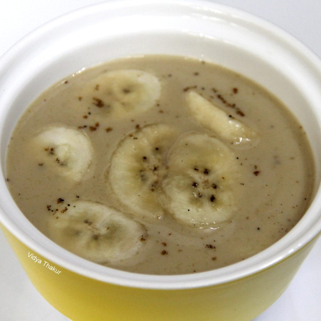 In a mixing bowl combine coconut milk and jaggery. Once the jaggery dissolves add cardamom powder, nutmeg powder, sliced bananas.