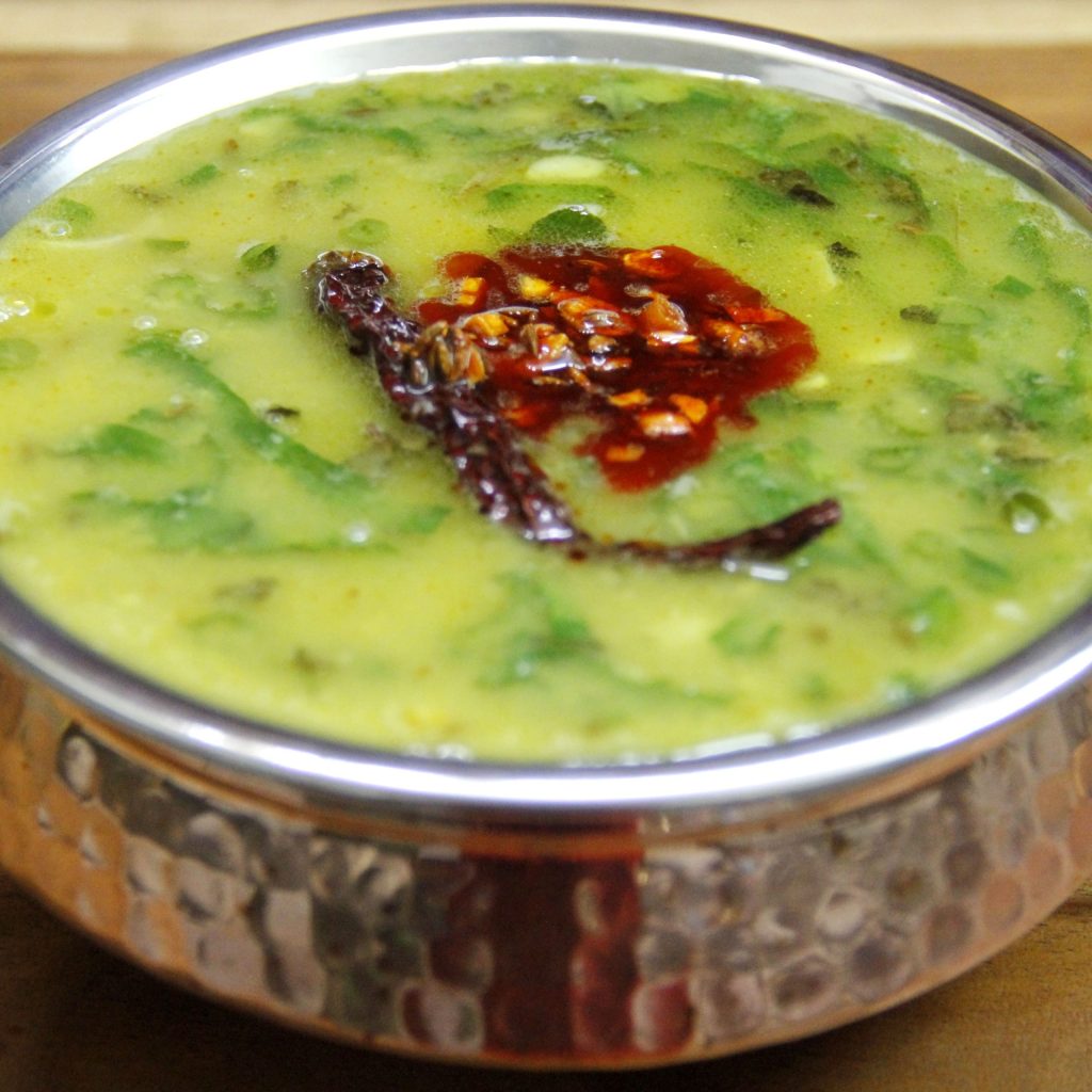 Wash toor dal and soak in water for an hour. Pressure cook the dal along with a pinch of asafoetida and a pinch of turmeric powder for four whistles, so that it’s mashed well. After the pressure settles down , remove dal from the cooker.