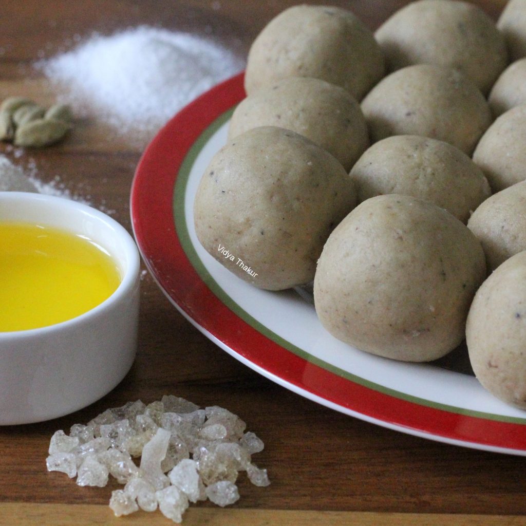 When warm mix the whole wheat flour, crushed edible gum and powdered sugar and cardamom powder. Shape into small lemon sized balls when warm itself.