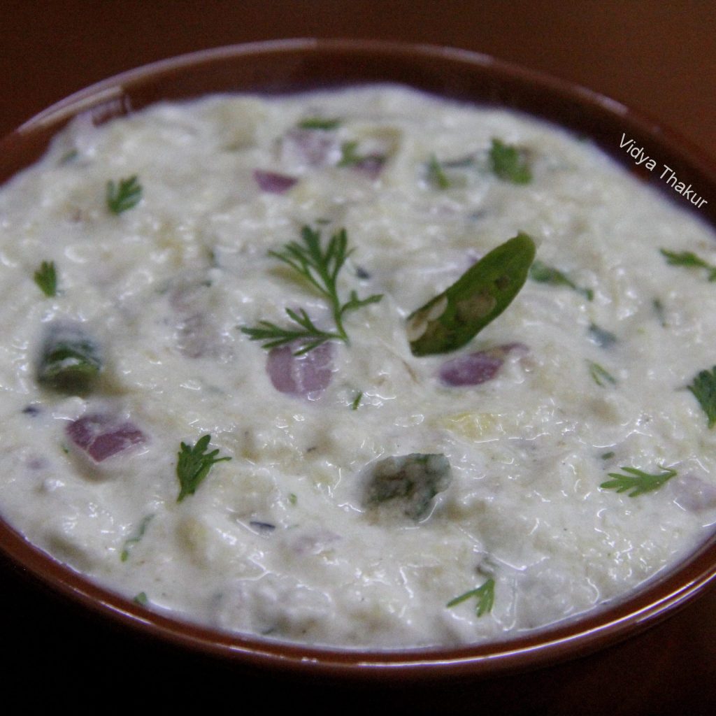 In a mixing bowl whisk curds, add the mashed brinjal,onions,green chillies, salt and sugar to taste. Mix well, garnish with coriander leaves.