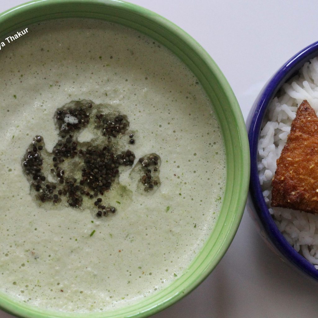 - Grind coconut scrapings, green chillies,cumin seeds,coriander leaves, asafoetida, tamarind to a slightly coarse paste, adding little water. Transfer to a serving bowl. Add water to get the desired consistency. It should’nt be watery. Add salt as required.