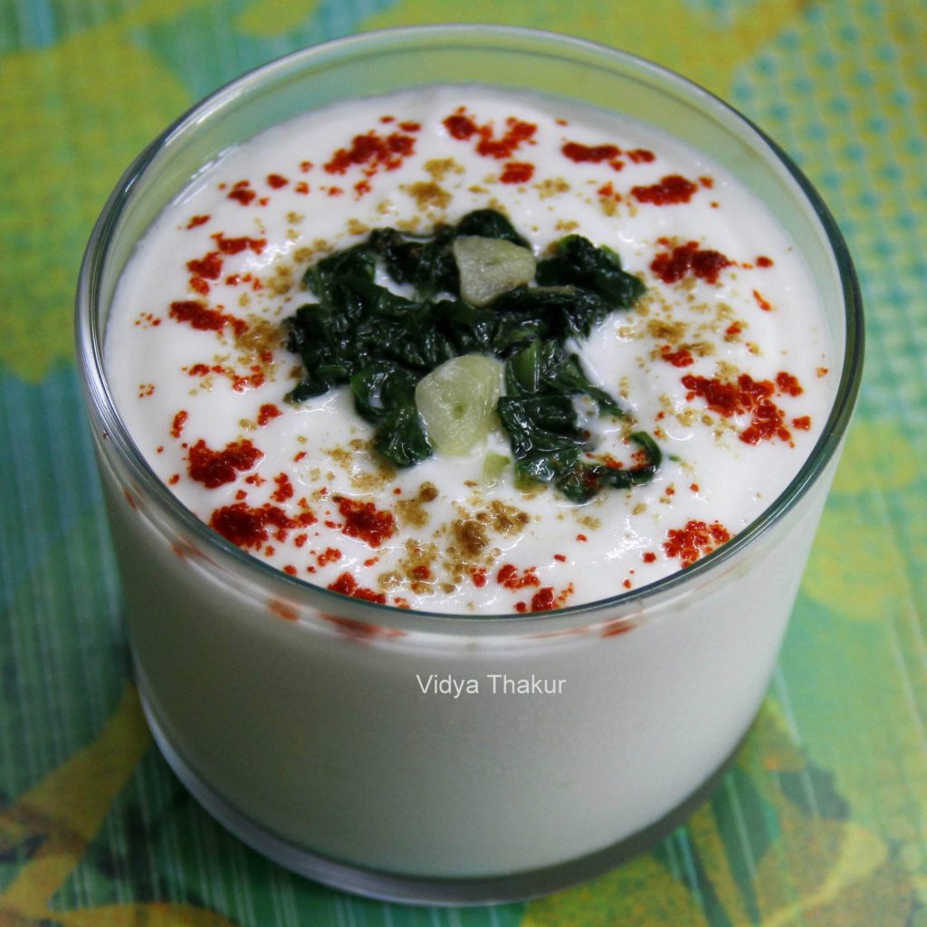 Referigerate for at least an hour. While serving sprinkle rest of the roasted cumin powder and red chilli powder and shredded blanched palak to garnish.