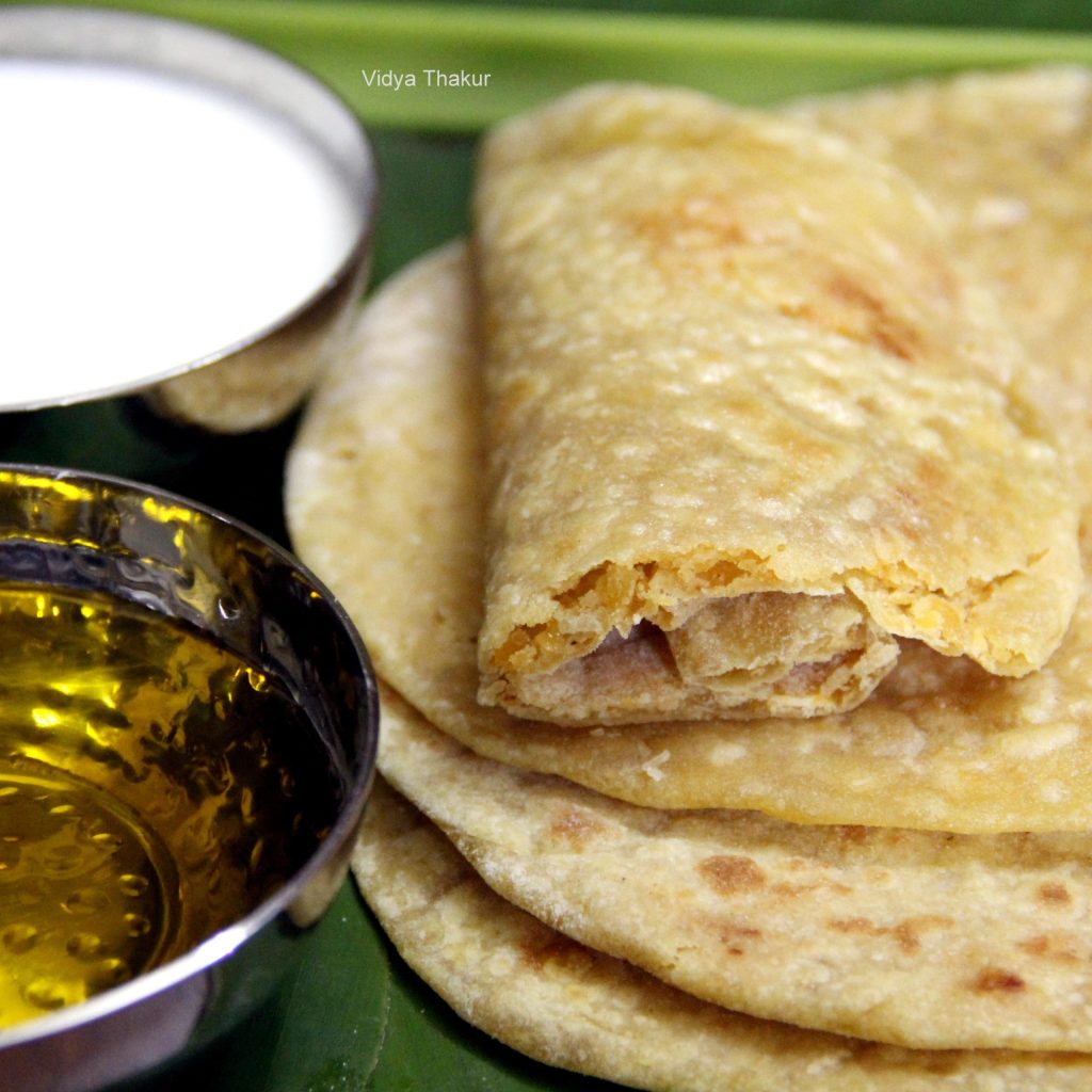 Puran Poli is a popular maharashtrian bread stuffed with bengal gram and sugar/jaggery filling. Puran polis can be eaten by dipping them in melted ghee or milk or just as is. They taste great any which way you like it.