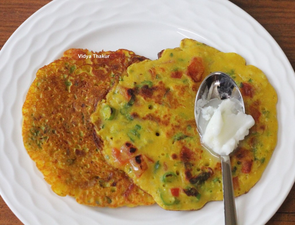 Tomato omlette is a simple easy peasy pancake recipe that is prepared using gramflour as its main ingredient and a regular in Maharashtrian cuisine better known as dhirdi. This pancake gets its name as Omlette even though it is eggless since it resembles an egg omlette. Usually in restaurants it is served with tomato sauce and mint chutney and bread slices, I personally love it with a dash of white butter and raw mango chutney.