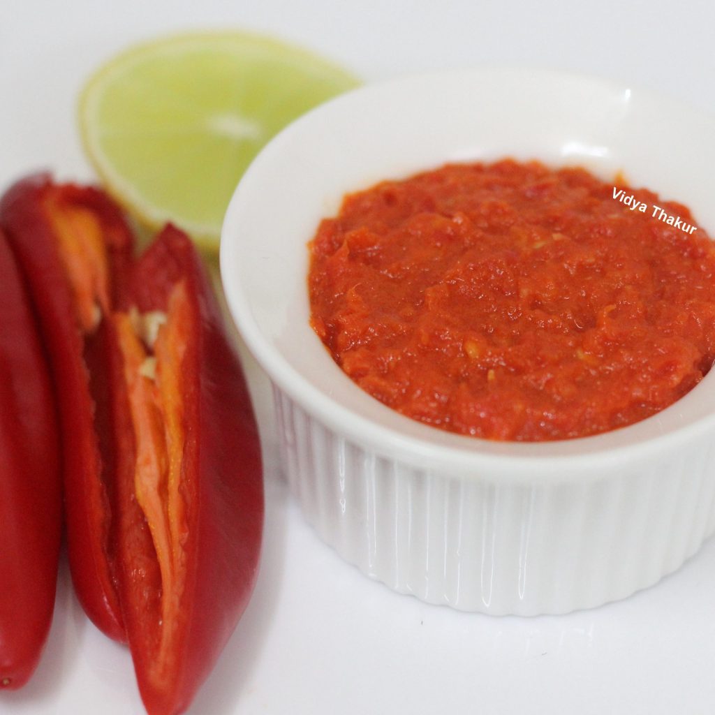 Thecha as the word goes traditionally means crushing on a grindstone. With changing times we have switched on to easier options like blenders and mixers, however the name to the recipe remains the same. But if you have access to a mortar and pestle or a grindstone go ahead and use it to prepare this thecha. It will definately taste the best. Fiery red fresh red chillies are in season, though they are’nt as fiery as they seem to be. It’s the right time to prepare red chilli thecha that goes perfectly well with bhakris, thalipeeth, parathas, dosas, dhirdis, pancakes and even with masale bhath ,simple rice/ pulav varieties. If you find it to be too spicy just add in some curds and serve it as a dip along with the above mentioned dishes. Posting a simple, easy, spicy tangy thecha recipe that’s simply loved by all at my place. This recipe was shared by a VEGGIE VENDOR who was kind enough to share the recipe but was shy to tell her name and I thank her for sharing the same. She uses a grinder stone to prepare the same. In her own words ” Tai patya varvantya var kara ani chav bagha kashi jhakaas asel” So very true. So if you have access to one go ahead and try it.