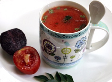 In a deep pan add chopped tomatoes, beetroot, 11/2 cups water and boil it till the tomatoes are soft.Let the mix cool. Grind the mixture and pass the puree through a strainer adding little water.