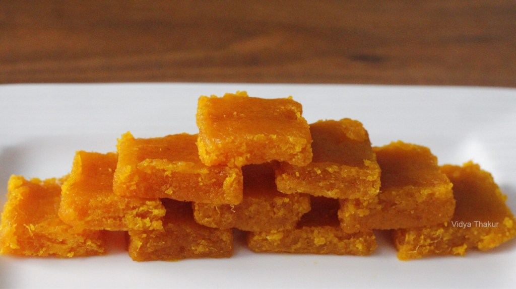 Mango Vadi is a special sweet from the Konkan region. These vadis are not very popular outside the konkan region, I personally think so as compared to amba naral vadi or amba barfi. As far as amba vadi is concerned I personally love them a lot as the basic mango flavour goes into these vadis. These vadis are sweet with a tinge of tanginess of mangoes. These vadis were a regular at my maternal grandparents place in Savantwadi and I loved it to the core. But I never gave it a try earlier as it requires a lot of stirring. Finally I did give it a try. The first time the taste turned out good but the vadis were very soft. The second try was a hit, though I also agree the cuts of the vadis are’nt perfect but that’s the way they looked when the vadis dried. A little patience is all that is required to get the perfect consistency.