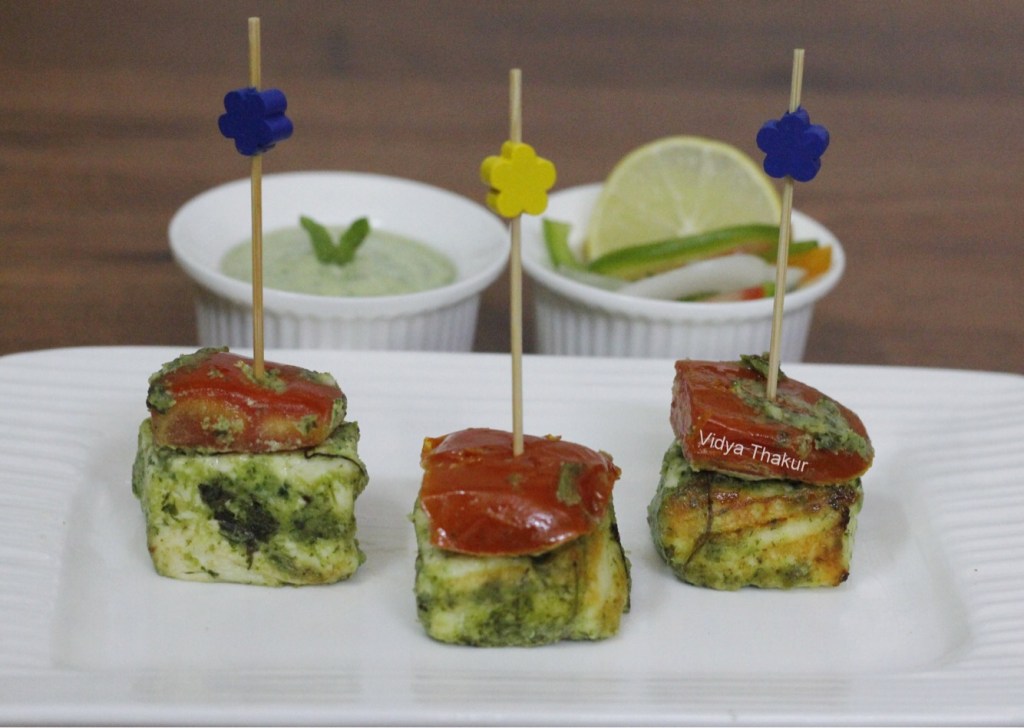 A quick and easy starter recipe that I’d tried at a wedding and actually tasted great and yes I liked the name too.The paneer cubes and vegetables were marinated with thick coriander mint chutney, arranged in a skewer and then cooked on a tawa till golden.