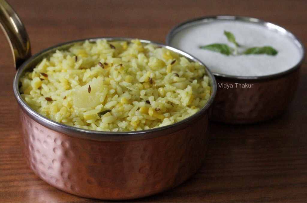 This simple meal is very quick and easy to prepare and yes easy to digest too. Any short grained rice can be used to prepare khichdi. Usually it is prepared with ambe mohar rice as it is aromatic OR Indrayani rice, as these varieties of rice give the perfect khichdi texture. However you can use whichever rice available. I have used Ambe mohar rice. Moong dal is the healthiest among all pulses, is packed with high level of protein and is extremely light and easy to digest. This wholesome khichdi of rice and moong dal using minimum spices is an ultimate comfort food. A quick and easy Maharashtrian comfort meal with spiced mint buttermilk as an accompaniment.