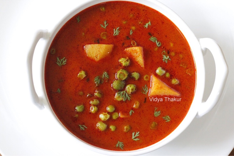 Recipe credit of this delectable vatana batatyacha rassa goes to my late mom-in-law NANDINI THAKUR. A very easy and very tasty recipe using easily available spices. A no onion, no garlic recipe, it is a regular on fasting and festival days in Maharashtrian cuisine. Simple flavourful recipe.