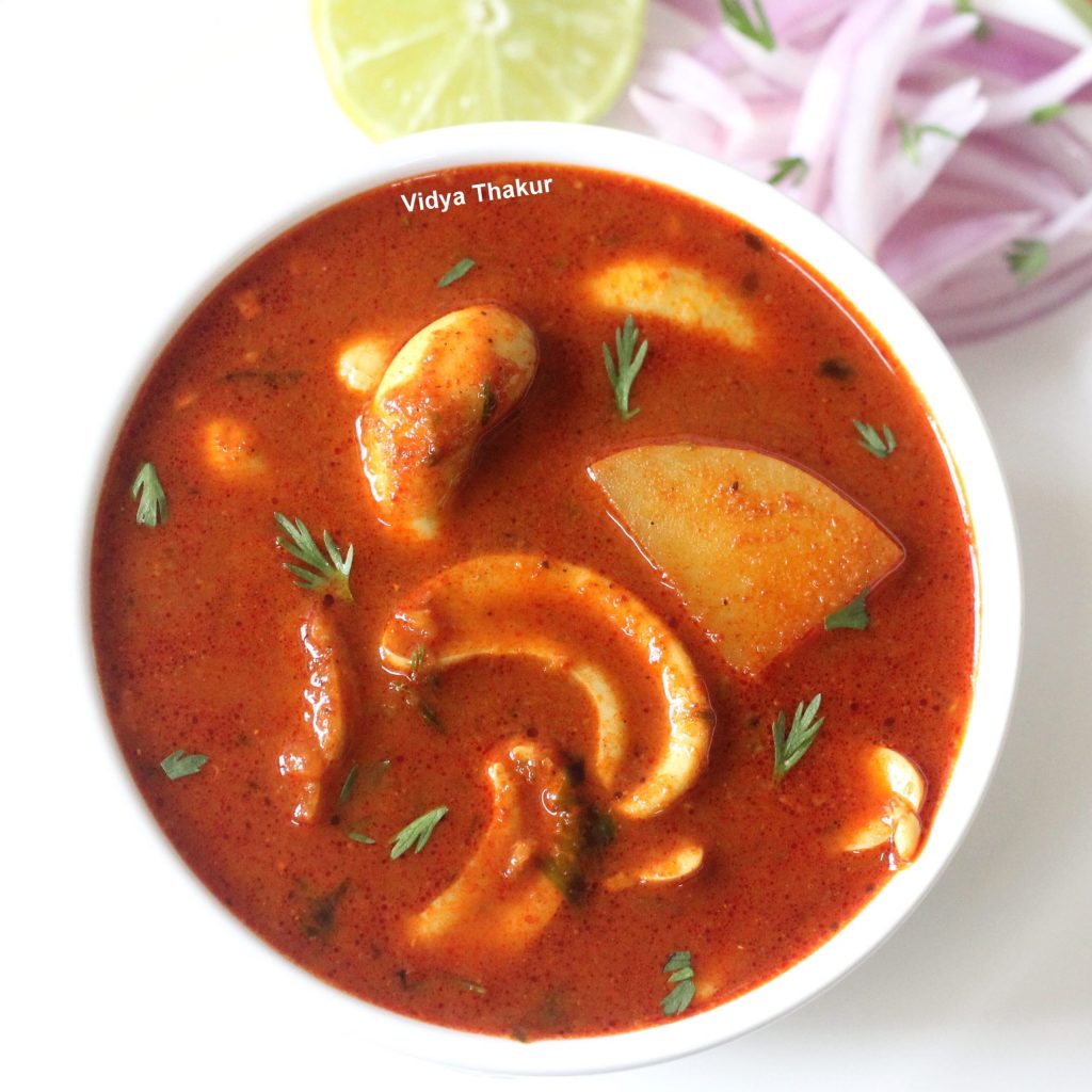 - Serve hot with rice, solkadi, onion tomato salad and a pickle of your choice or with bhakris or sorghum flour vade recipe of which has been posted earlier.