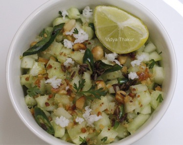 A delicious cucumber salad with the crunch of peanuts,tang of fresh lemon flavour and added flavour of tempering. This salad goes well with steaming hot rice, dal or even with rotis.