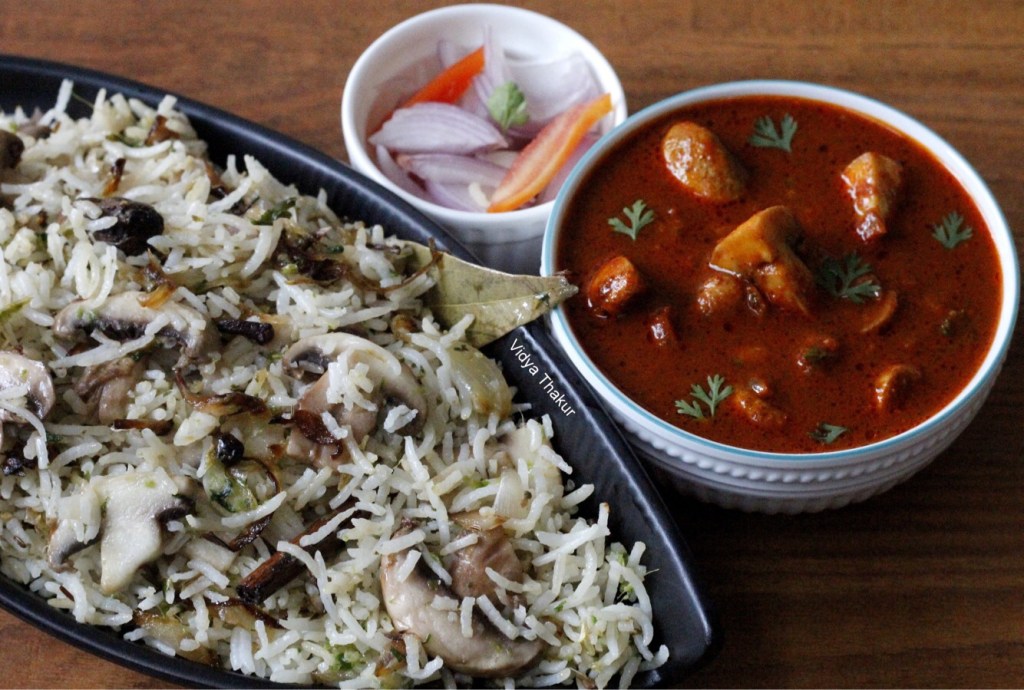 Mushroom Rice is an easy, delectable recipe that tastes great with raita or any spicy gravy as an accompaniment. Posting the same below with tomato onion salad and Malwani mushroom masala the recipe of which I have posted earlier.