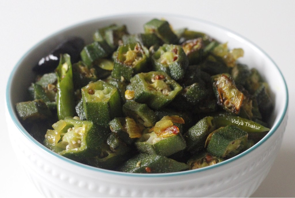 - Heat oil in a nonstick/ ceramic pan, add mustard seeds, when they splutter add asafoetida,green chillies,onions saute well till transluscent, then add turmeric powder, saute well,add sliced okra and saute, add kokum and stir fry over low heat till done. Okra shrinks as it cooks, hence add salt after it is almost cooked.