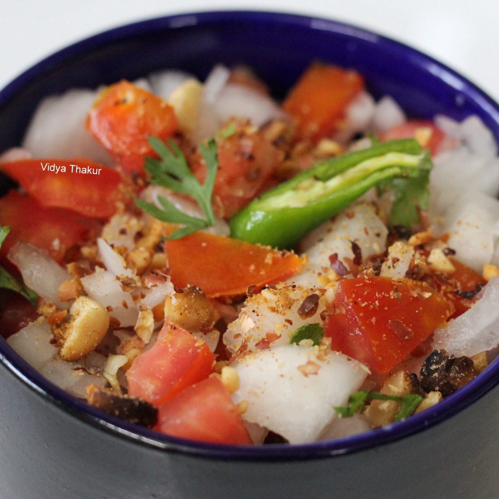 In summers we tend to relish more onto simple salads. Kanda Tomato Koshimbir is one healthy maharashtrian salad recipe which is usually served as an accompaniment with dal rice and rotis and yes it tastes great all by itself too. We should consume more of the seasonal vegetables, white onions being one of them. Hence used white onions in this salad. You can use red onions too. Tomatoes are rich in natural Vitamins most important being A, K ,C, hence is an immunity booster. It is also rich in folate, iron, lycopene. The combination of onion and tomatoes along with peanuts crush results in a yumm salad / koshimbir.
