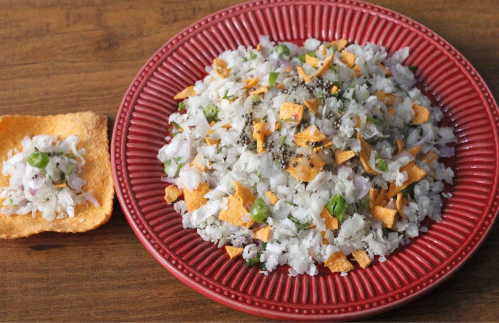 Fry the papad of your choice, crush them and keep aside. Mix onion, fresh grated coconut, green chillies, salt, coriander leaves and crush it with your hand so that it releases moisture. Add thin poha as much as it fits into the mix so that the pohe become moist.