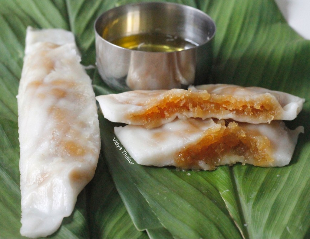 Turmeric leaves are very fragrant and they impart an awesome aroma and flavour to the dish that’s cooked in it. Available during monsoons and the onset of the festive season right from mid July till Navratri, these turmeric leaves are used to prepare naivedyam recipes. One such aromatic and flavourful naivedyam recipe is Patholi. Patholis are sweet, rice dumplings steamed in turmeric leaves. There are different variations in preparing the rice batter. I find the one posted below to be the easiest. Traditionally, rice is soaked in water and then ground to a thick batter, but these days modak flour is easily available, hence I skip soaking the rice, instead I make a thick paste out of the basmati rice flour. You need to use modak flour only for best results as it gets steamed perfectly. Posting my version of patholis below which is also offered as naivedyam.