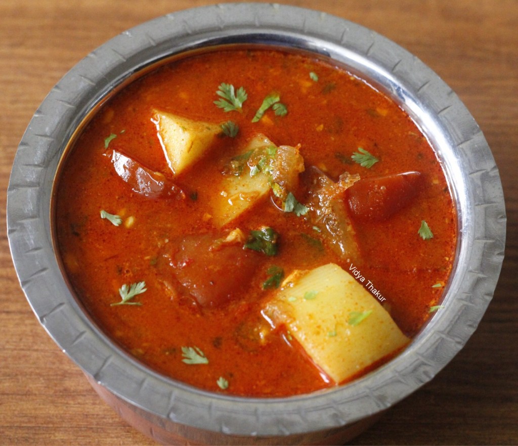 This is a spicy and tangy recipe that can be cooked with basic ingredients easily available at home. The spicier the gravy, the tastier it will be. Minor variations in a recipe gives rise to another delicious recipe. Tomatoes, potatoes and onions are always available at home and this recipe is a saviour when you want to dish up a spicy delicious gravy in minimum time. Kanda khobra miri cha vatan as it is.called in Marathi, that is a ground mix of coconut, onion and black pepper gives added flavour to this simple recipe.