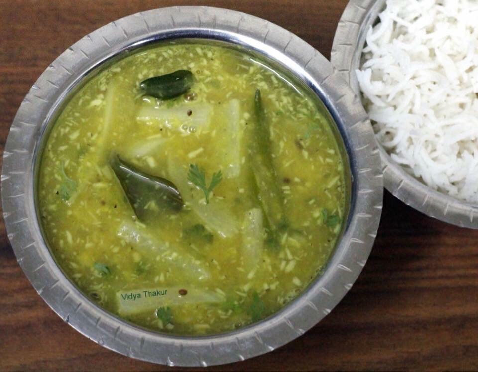 - Garnish with coriander leaves. Serve hot with steaming hot rice and vangyache/ batatyache Kaap.