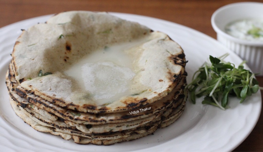To add to its nutritional value I have added fresh samudra methi leaves too. Here the bhakris are made with fresh samudra methi leaves.As the name suggests Samudra Methi are fenugreek leaves grown near the sea on sandy tracks and these leaves are very tender as compared to the regular fenugreek leaves. The roots of these leaves are also very tender and can be used for cooking too. These leaves need a lot of rinsing though as it has a lot of sand in it, but considering its health benefits and nutritional values, it’s worth the effort taken.