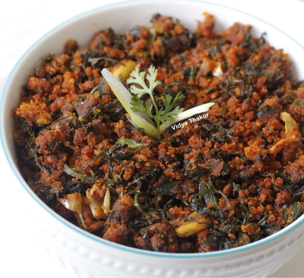 - Wash and finely chop the coriander leavesWash and finely chop the spring onion whites . Heat oil in an iron kadai. Add mustard seeds. When they splutter add a pinch of asafoetida, chopped garlic. Saute well till you get the aroma, then add turmeric powder, ginger, crushed green chilly, chopped onion whites and saute well till the onions are soft and transluscent. Then add chopped coriander leaves,saute well till they wilt.Add red chilli powder, salt and mix well. Finally add roasted besan, rice flour mix a tablespoon at a time,sauteing continuously.