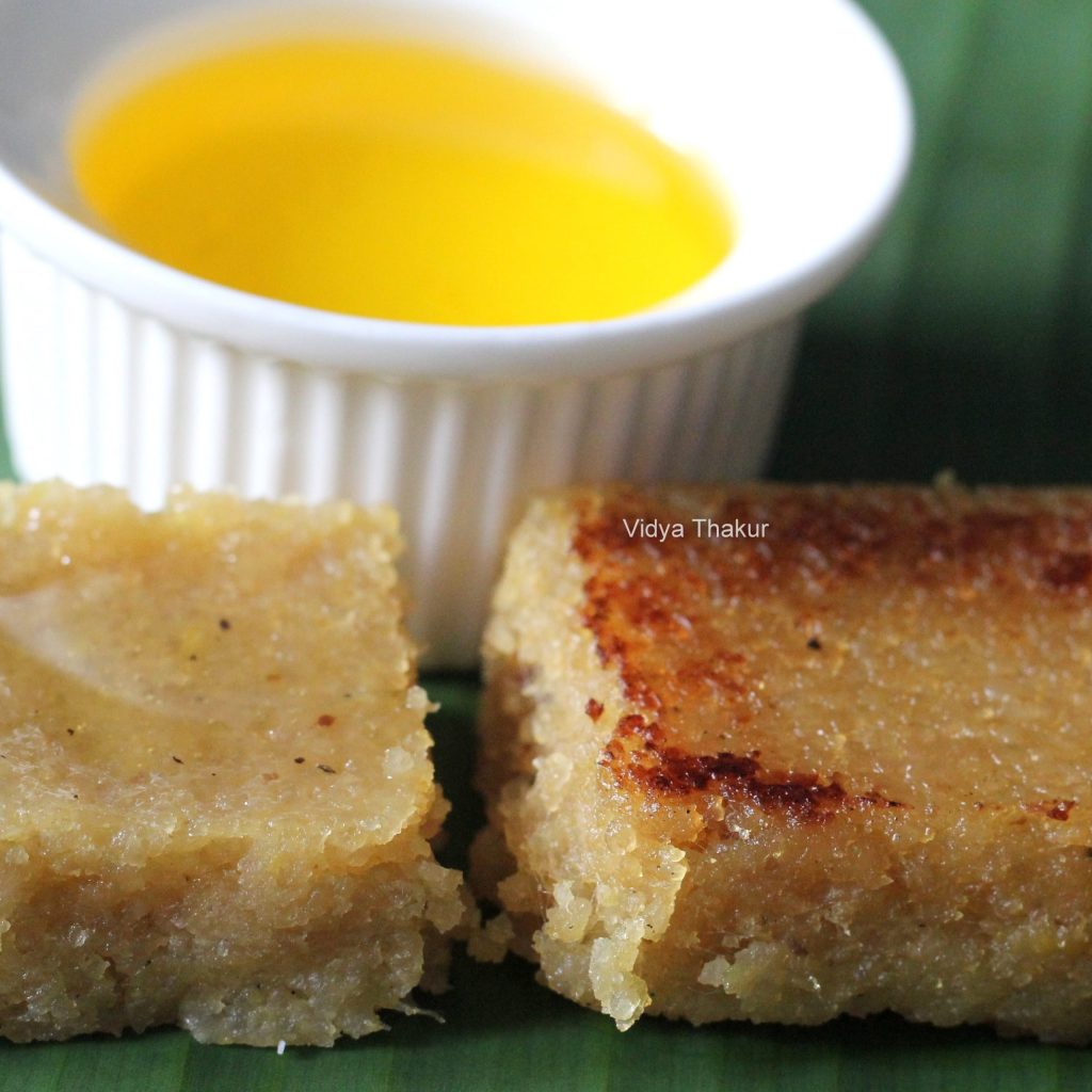Once done, let it cool, then remove the banana leaf, turn over the container/ plate on a larger flat plate, the jackfruit cake will get transferred to the flat plate easily. Remove the banana leaf, cut the cake into cubes, warm the dhondas bit on a tawa/ skillet and and serve it topped with melted ghee.