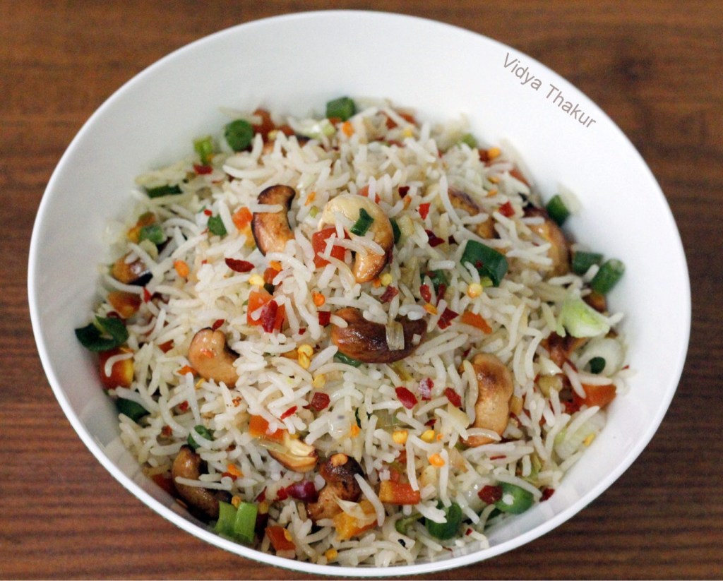 A simple fried rice recipe with the added goodness of crunchy cashews and spiciness of chilli flakes. Actually Jasmine rice is used in Chinese cooking, here I have used basmati rice. I adapted the idea of adding cashews and chilli flakes to fried rice from The Mainland China Cookbook by Anjan Chatterjee and the taste was awesome.I thank the author for this combo recipe.
